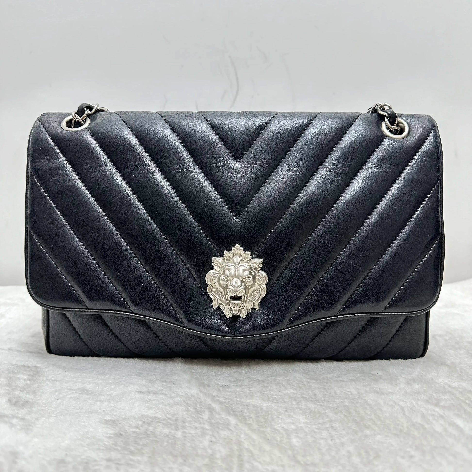 【#271】Pre-owned Chanel Classic Flap Vintage Lion Head V-Stitch Limited Edition Black Silver Cowhide Shoulder Bag Crossbody Bag BJ2010-2011